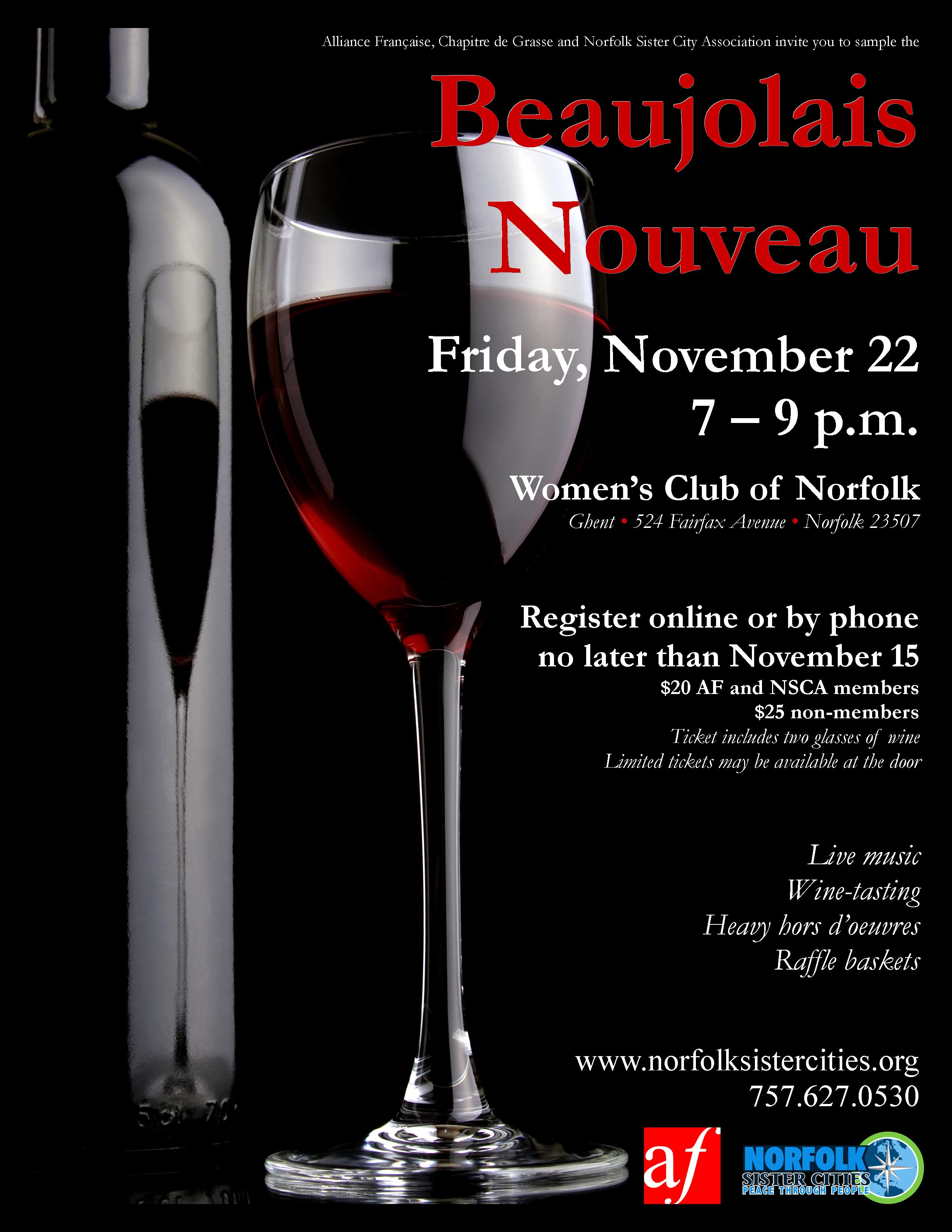 Ticket price includes two glasses of wine, heavy hors d’oeuvres (buffet campagnard of French cheeses, saucissons, and other tasty fare), and live music.