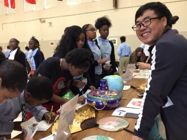 held for the benefit of students at the Academy of International Studies at Rosemont. Eight of our ten sister city committees participated. Over two hundred middle school students engaged in an international trivia challenge complimented by the sights and tastes of many different lands!